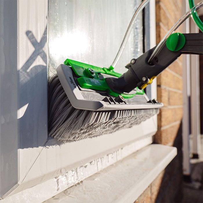 Krachtig reinigingsvermogen, groot reinigingsoppervlak. Schuine achterkant voor grotere oppervlakken, frames en hoeken. Hoge borsteldichtheid, uitstekende reiniging met weinig buiging van de borstelharen. Speciale borstelsnede - gemakkelijke reiniging van hoeken met een hoek van 90°. Stoot- en randbescherming rondom, stevig verbonden. In het midden van de borstel ingebouwde nozzles voor een krachtige verwijdering van vuil. Speciale strip (rinsebar) met sproeinozzles boven de borstel voor krachtig spoelen. Inclusief slang met snelkoppeling.